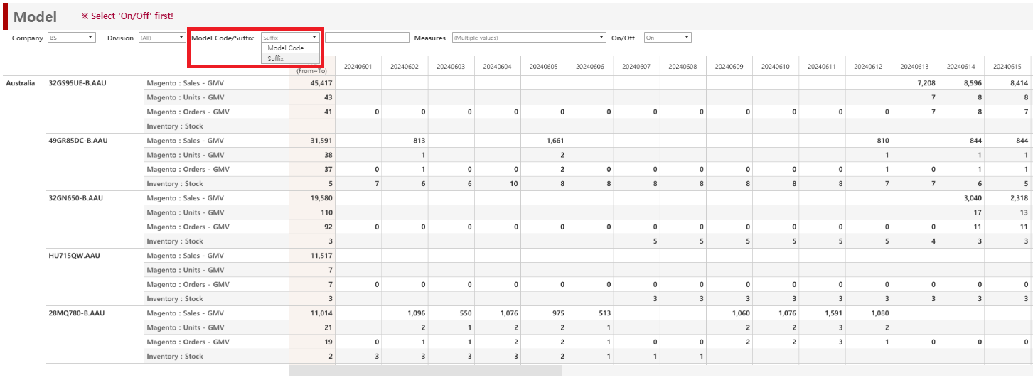 You can view data in Model.Suffix units by selecting the [Model Code/Suffix] filter in the Model area of the Magento & Inventory Raw Data Download dashboard.
