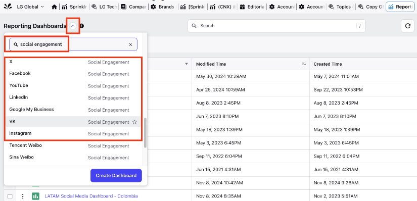 After pressing the arrow button and searching for Social Engagement in the search bar, the Standard Dashboard for each platform will appear at the bottom.