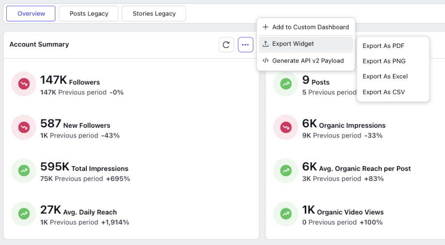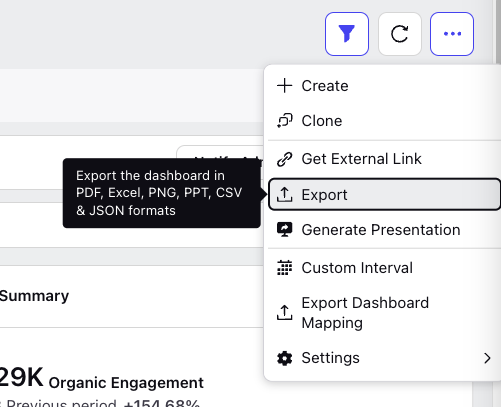 The ability to export the entire dashboard or a specific widget dashboard is located in the … top right of the dashboard and … top right of the widget.