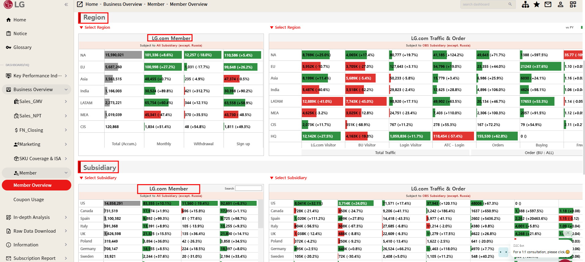 1. Go to Business Overview > Member > Member Overview dashboard and check 'Region' or 'Subsidiary part of the dashboard. Find a country you are trying to find number of members belong to.