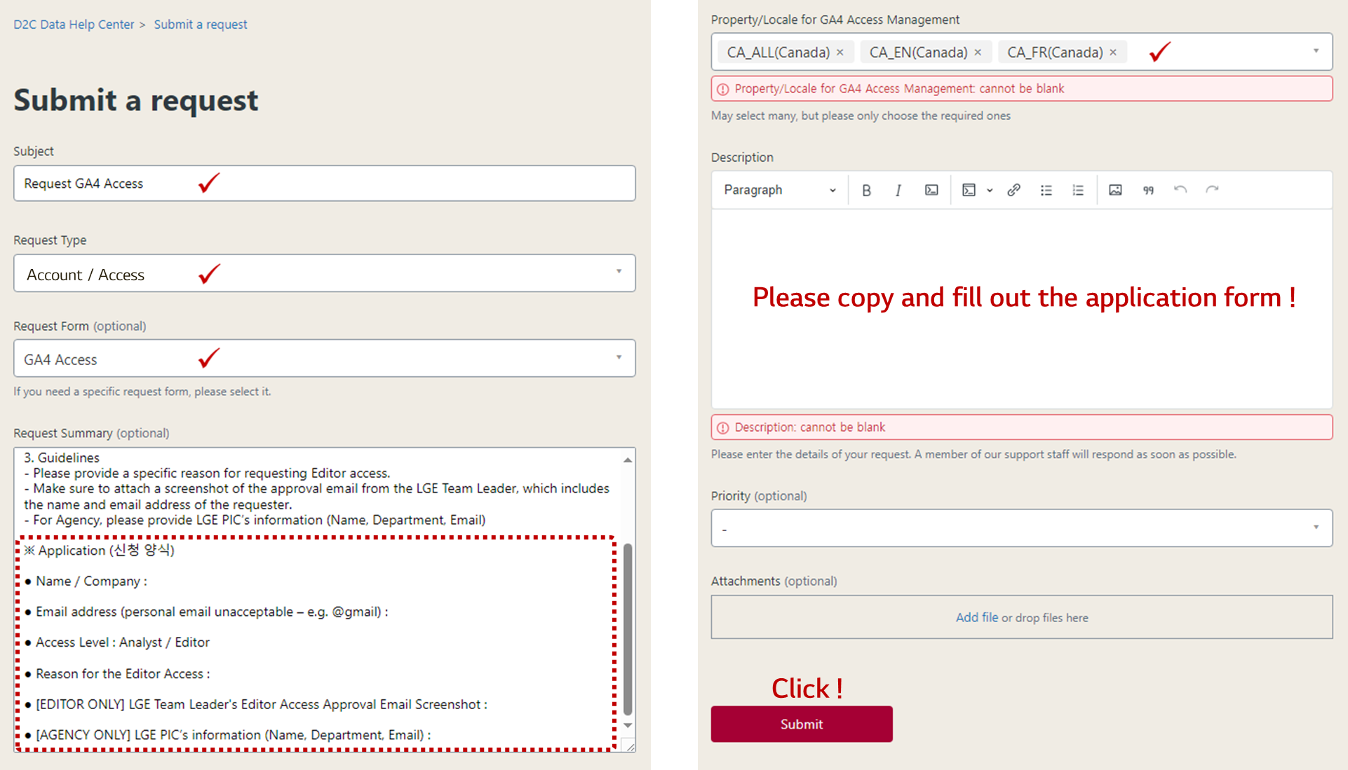 2. When you select GA4 Access in the Request Form, an application form and a property selection list will appear. Please fill out the application form and property and submit it.