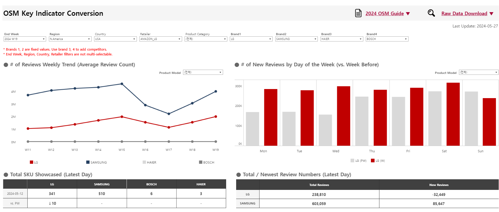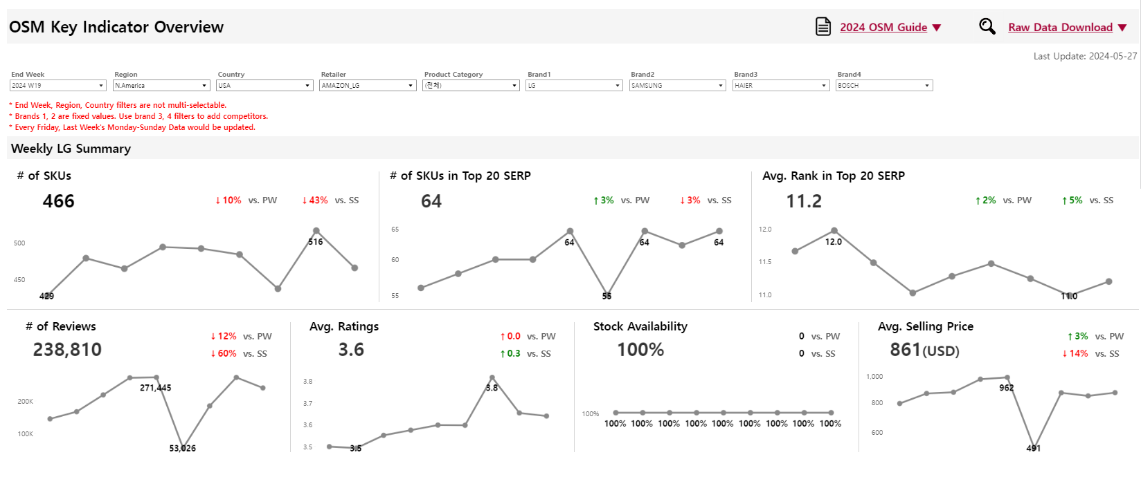 ➢ Track key information such as reviews, ratings, and inventory within the PDP (Product Detail Page) to provide LG products OSM trends for the latest 8 weeks