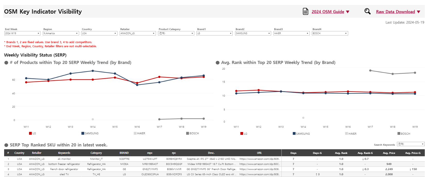 - Avg. Rank in Top 20 SERP : Avg. Rank of LG SKUs in latest week exposed in search rank between 1 and 20