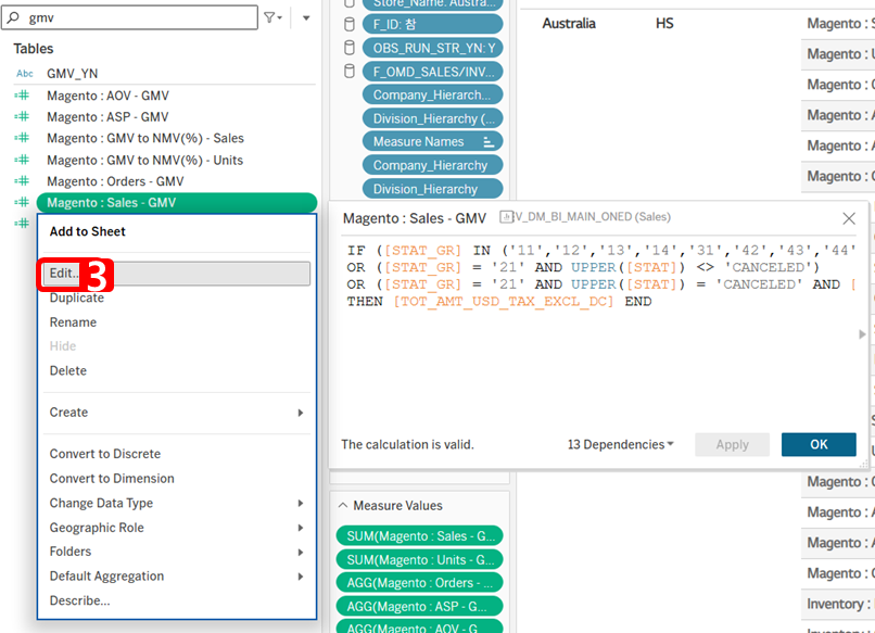 3. 수식 확인이 필요한 필드를 마우스 우클릭 후 Edit을 클릭하면, 필드의 수식을 확인할 수 있습니다.
