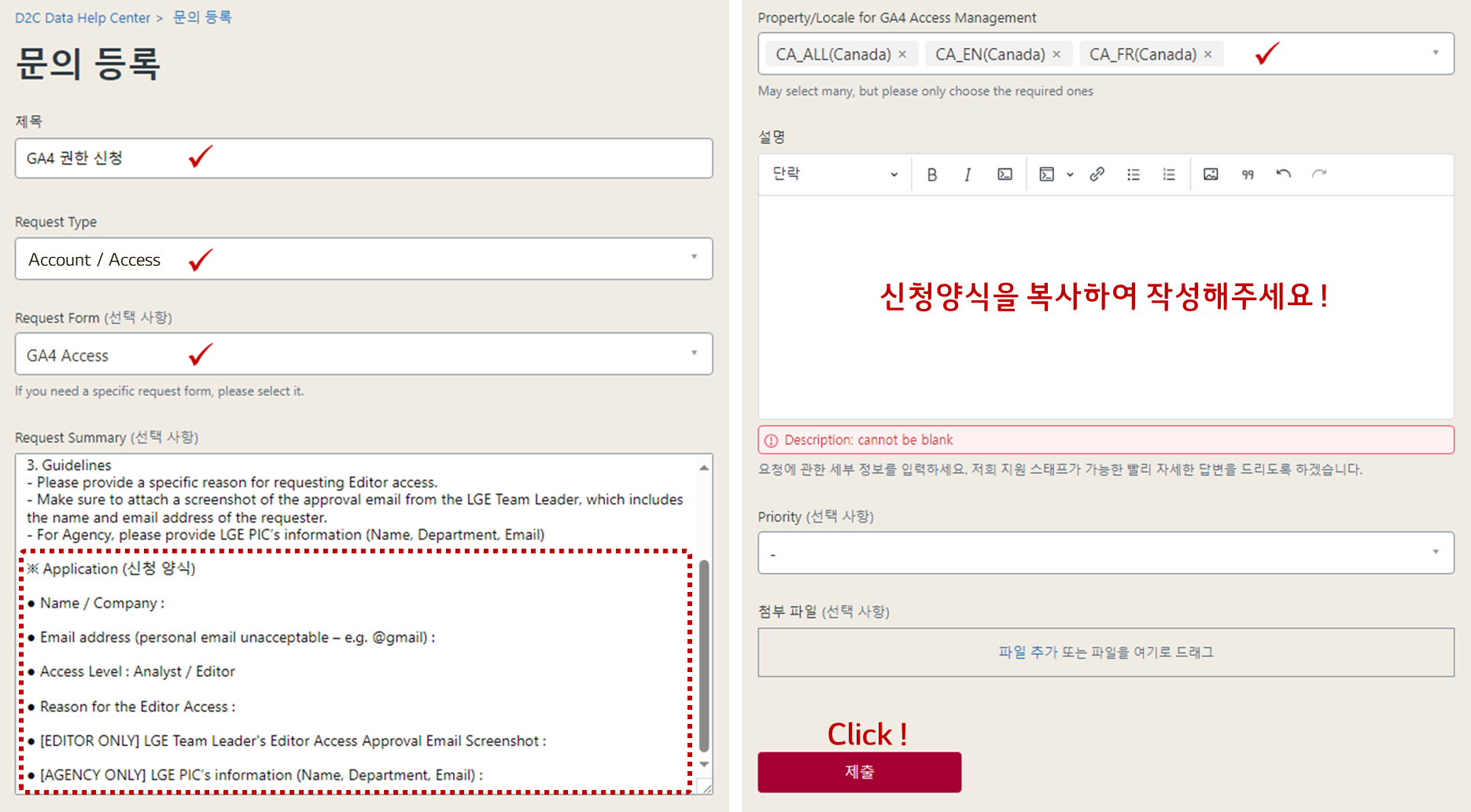 - Editor 권한 요청의 경우, 구체적인 이유와 1주일 이내의 LGE 팀 리더의 승인 이메일 스크린샷을 첨부해 주세요. (요청자 이름, 이메일 포함)
